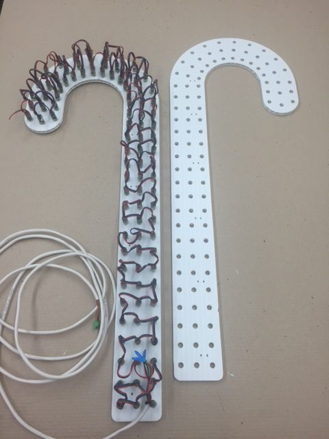 So now we are here to satisfy your sweet tooth. Our version of the Candy Cane is the ChromaCane. It is made from 10mm Coro. This is 2.5 times thicker than the 4mm at about 3/8" thick. They allow you to focus the LED to your audience without having to be diffused similar to our CoroArches. The ChromaCane is almost 36" tall with 99 mounting holes for 12mm Pixels or RGB nodes in a 3 row by 33 column matrix. We designed them to be ziptied to a stake or our preferred method a segment of 1/2" EMT Conduit. The universal design allows the ChromaCane to be either left hand or right hand. You can have a ChromaCane ready to go in about 5 minutes, that's it. All you need to do is load your pixels or RGB nodes and hook it to your controller. For the model you will create a 3x33 matrix to get the best effects.