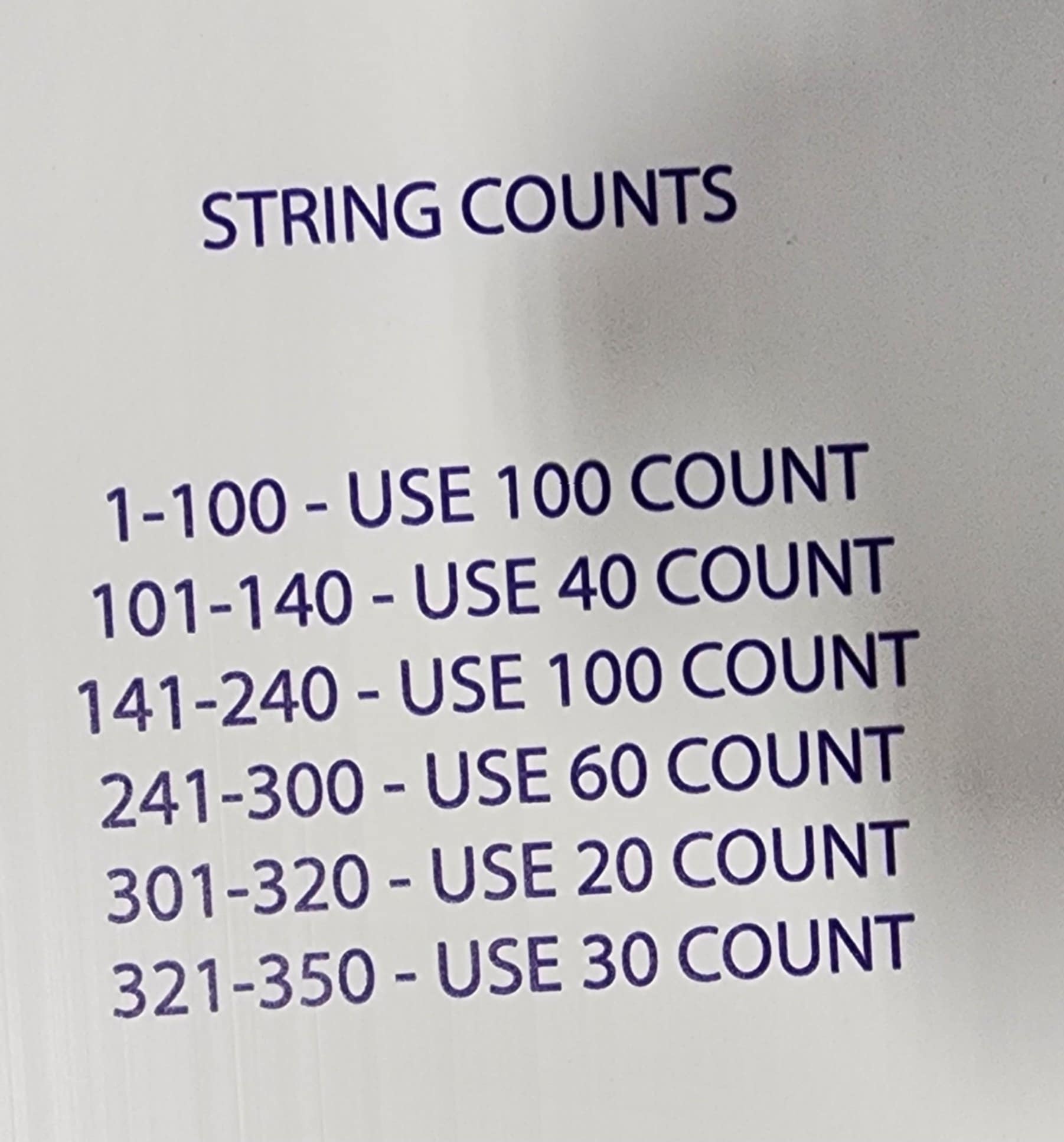 • String counts required - 2-100ct, 1-50ct, 1-40ct, 1-30ct, 1-20ct, 1-10ct