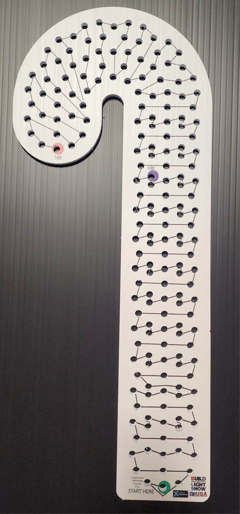 The 189 node Insane Cane is the result of a collaboration between Build A Light Show, Gilbert Engineering and xTreme Sequences, and is probably the most effect capable candy cane in existence.