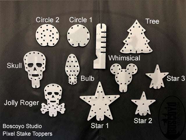 The Boscoyo Peace Family Pixel Stake with Toppers is made with the 12" 5 node stake available in Black or White 10mm coro made to attach different toppers. Depending on toppers the node count changes.